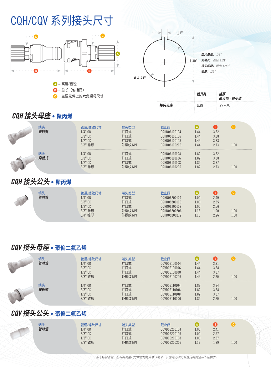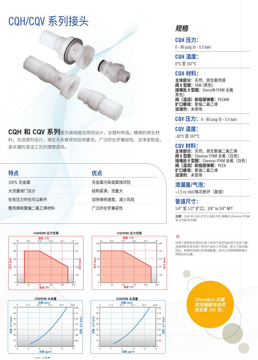 The CQH Series Couplings are designed for high-purity use and features all plastic construction. Molded, virgin materials and lubricant-free design enable use in the most demanding applications. Broad chemical compatibility and cleanroom manufacturing make them ideal for use in critical wet processes.