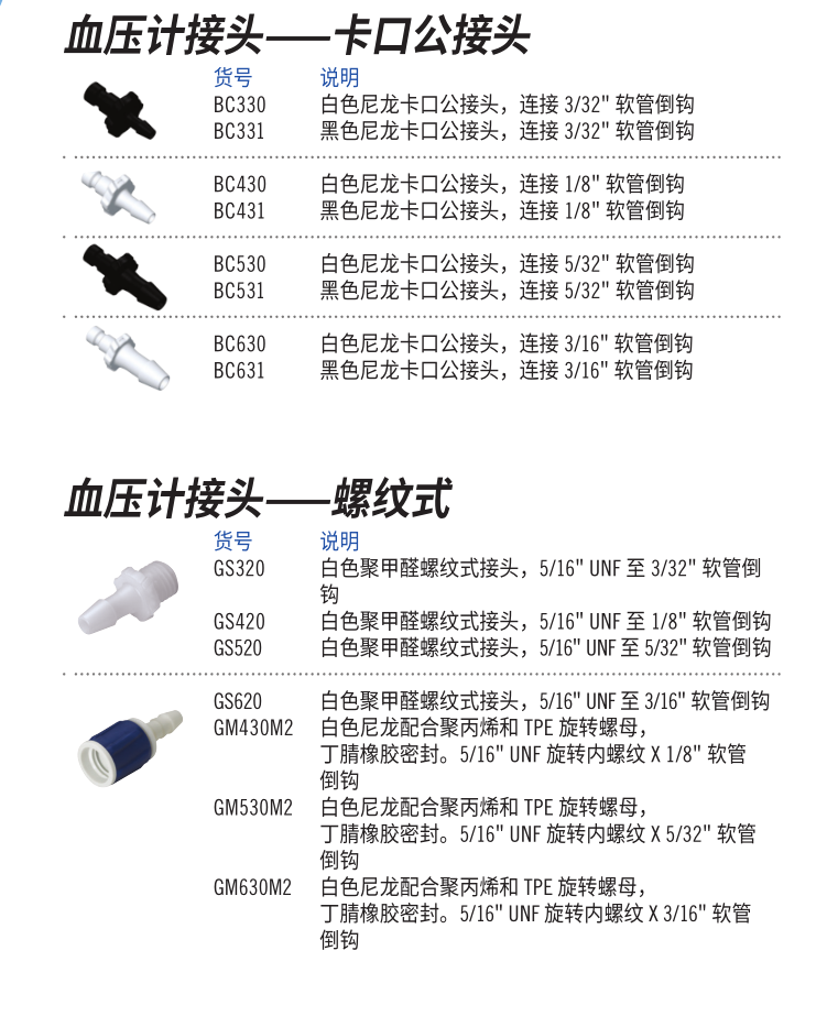 采用CPC的普通接頭、魯爾接頭與血壓計用連接器,以確保每一次精準(zhǔn)的連接。 我們的血壓計用連接器采用精密軟管倒鉤和螺紋形式。不管您需要是什么類型的連接器 - 卡口式組裝件、SMC、直彎、螺紋和多管道連接器 ,我們均可以提供血壓計袖帶使用的無泄漏解決方案。對于有限度或一次使用的要求,則不需要截止閥, 那么高品質(zhì)、精密成型以及低流量的魯爾連接器便是你的首選。